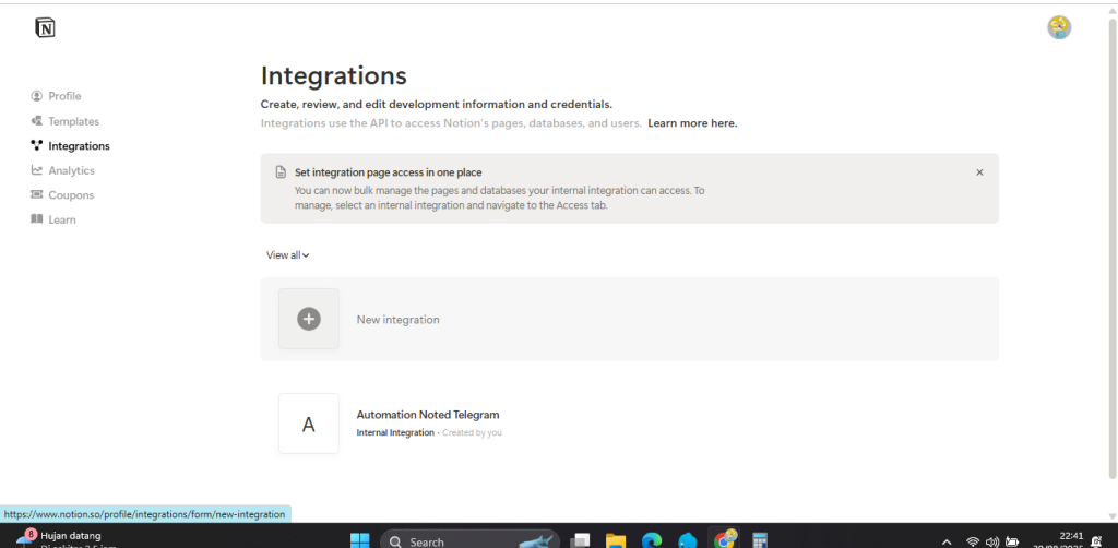 lalu lanjutkan membuat api key notion bisa klik link ini lalu masuk ke View my integrations