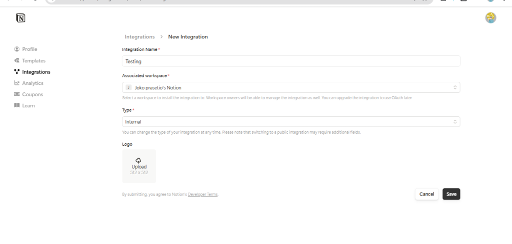 buat integrasi baru dengan cara klik new integrations