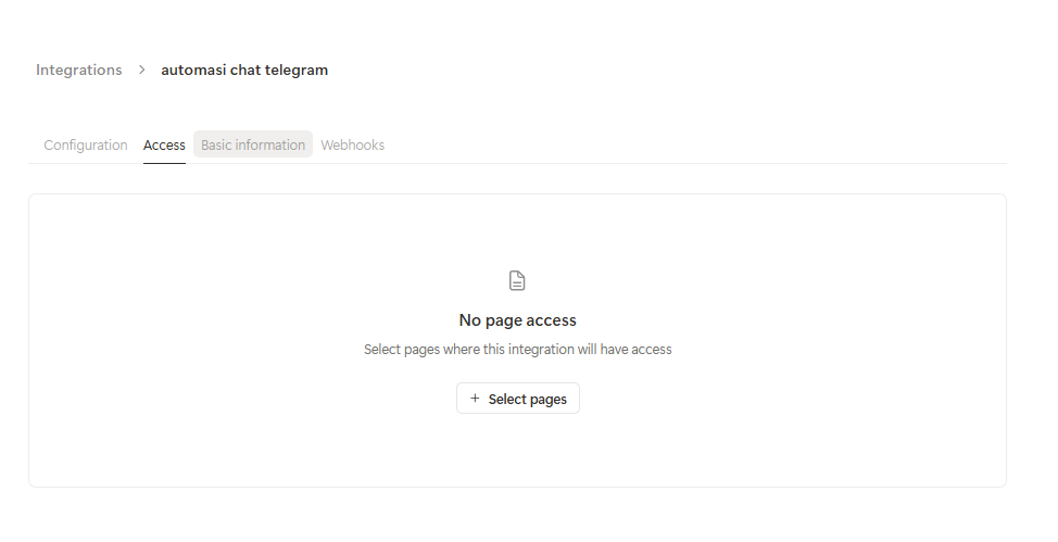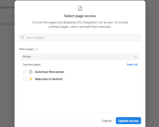 klik titik tiga, edit part integrasi yang sudah dibuat masuk kebagian -> Access -> klik select pages lalu pilih pages database yang tadi sudah dibuat di notion