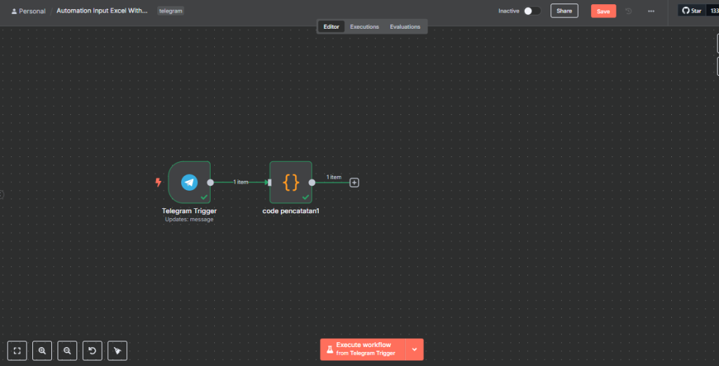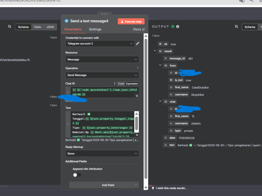 klik execute step untuk melakukan testing, bahwa node telegram sudah terhubung dengan bot telegram