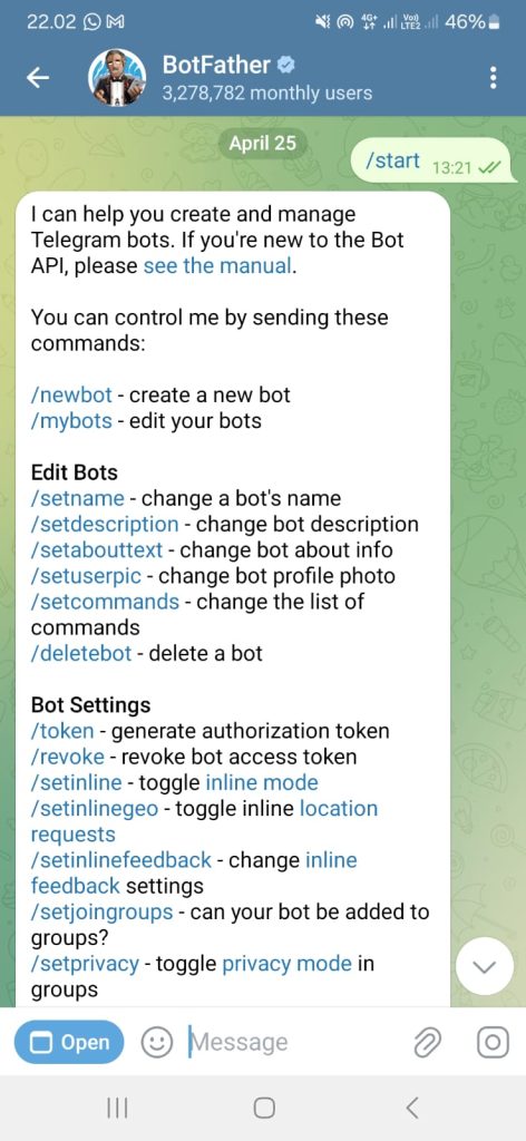 Ikuti langkah dari pedoman yang ada di bot father dan siapkan bot kamu untuk melanjutkan ketahap integrasi dengan node telegram