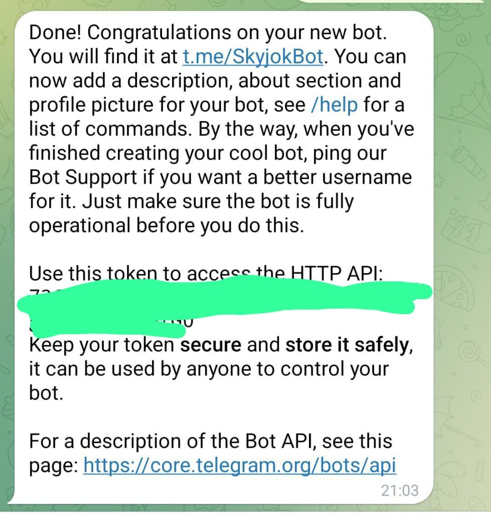 Jangan lupa simpan API key tersebut, karena akan digunakan untuk integrasi Node Telegram dengan bot Telegram.